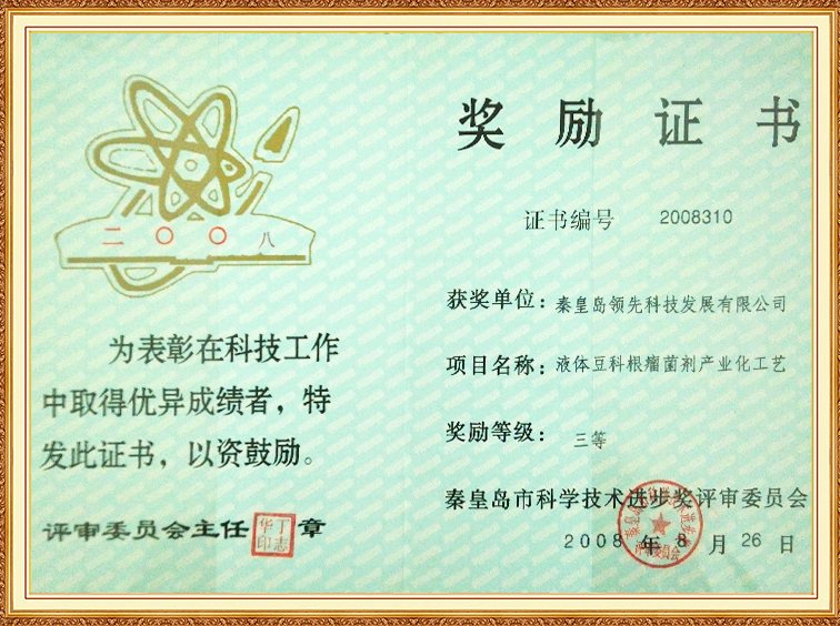 液体豆科根瘤菌剂工业化工艺—秦皇岛市科学技术进步三等奖
